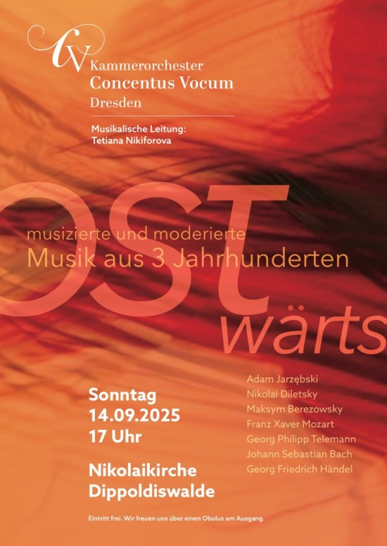 Unser nächstes Konzert findet am 14. September 2025, 17 Uhr in der Nikolaikirche Dippoldiswalde statt. Es steht unter dem Titel „Ostwärts: Musizierte und moderierte Musik aus 3 Jahrhunderten“. Dabei stellen wir Musik aus Tschechien, Polen und der Ukraine in den Mittelpunkt und schauen auch, wie Komponisten in Mitteleuropa darauf Bezug genommen haben. Wir freuen uns auf Ihren Besuch und heißen Sie herzlich willkommen!